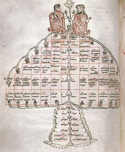 A sa création, pour éviter l'endogamie, l'arbor consanguinitatis comportait sept degrés et sept à sa partie supérieure. L’aristocratie avide d'alliances, n'éprouvait aucune difficulté de trouver une dynastie hors de son territoire mais pour le serf attaché à son seigneur, la difficulté de trouver une épouse en était grandement accrue. Aussi les degrés de parenté furent, à partir du quatrième concile de Latran en 1215, réduits à quatre. Le sommet est occupé par un couple indifférencié. Dans chaque case figurent les parents non épousables.