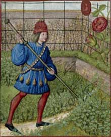 Le guichet du beau verger vert! [...] De voir son maintien, son visage. Lors donc, à droite je m'engage Dans un sentier tout parfumé, De menthe et de fenouil semé. Tout près de là, suivant mon guide, J'entrai dans un réduit splendide Où le beau Déduit se trouvait. |