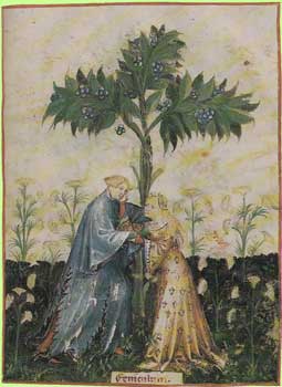 Cher et doux ami, prendre du bon temps, dans un verger me ferait du bien. [...] Par la porte elle entre dans le verger qui est conforme à ses désirs. Au milieu du verger se trouvait une ente chargée de fleurs et d'un riche feuillage qui s'évasait largement vers le bas. On avait conduit les branches |