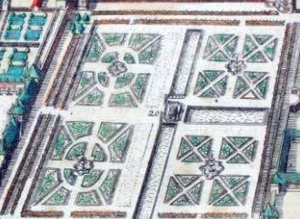 Dans les carrés du jardin, il y a des arbres, mais surtout des herbes, du buis et du romarin dans lesquels sont taillées mille fantaisies: hommes, chevaux, navires et toutes sortes d'oiseaux ou animaux; dans l'un des carrés sont dessinées très curieusement avec de toutes petites plantes les armoiries du roi et des lettres antiques."